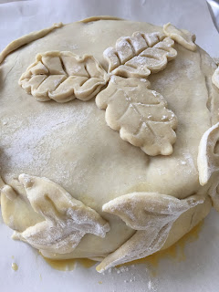 Roll the puff pastry into a 14-inch square on a lightly floured surface. I didn't photograph where I put a "schmear" of raspberry jam (apricot works well, too). You can add about an ounce of sliced, toasted, almonds if you desire. Then place the Brie on the center and fold the pastry up and over the cheese. Flip it over onto a parchment covered baking sheet. Cut off any excess puff pastry. I used the extra puff pastry to cut out some leaf shapes with some small cutters that I have.