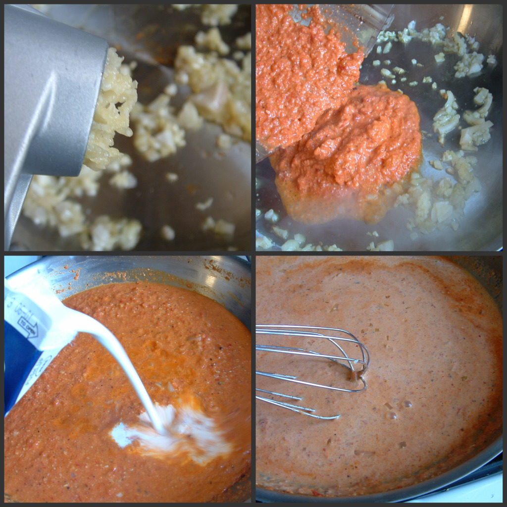 Do you remember that Antipasto Pasta Salad that I recently posted? I had some roasted red bell pepper, in a jar, that was left from that recipe. I was tired, hungry and tired of eating out (which we did most of last week– due to my aforementioned non-cooking mood). I adapted this recipe from The Pioneer Woman. The recipe is so easy, that I didn’t need to print it. I made a couple of adaptions– very minor so let’s get crackin’!