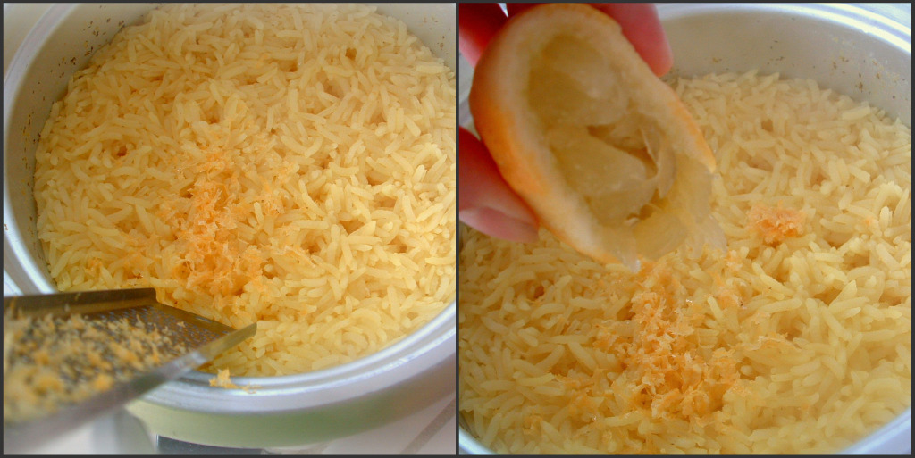 For “Yellow Rice”, I rinsed white rice, added about 1/4 tsp of tumeric, used half chicken broth and half water. When the rice was ready,
