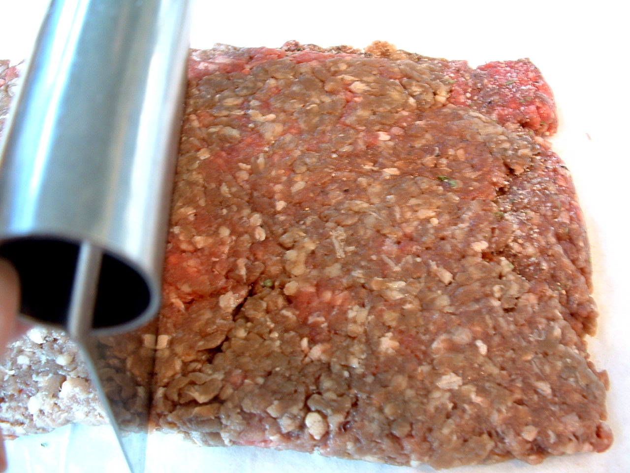 - Fold the meat in half, from side to side, using the parchment paper*. Use a pizza wheel, bench scraper or long knife, to cut the meat into 8 even squares.