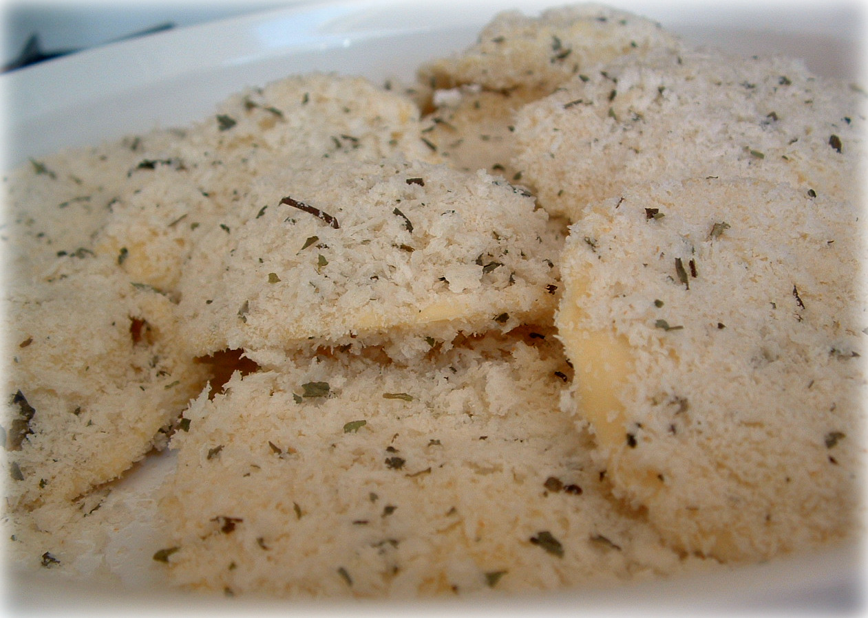 - Dredge ravioli in the bread crumbs. Place the ravioli on a baking sheet, and continue with the remaining ravioli.