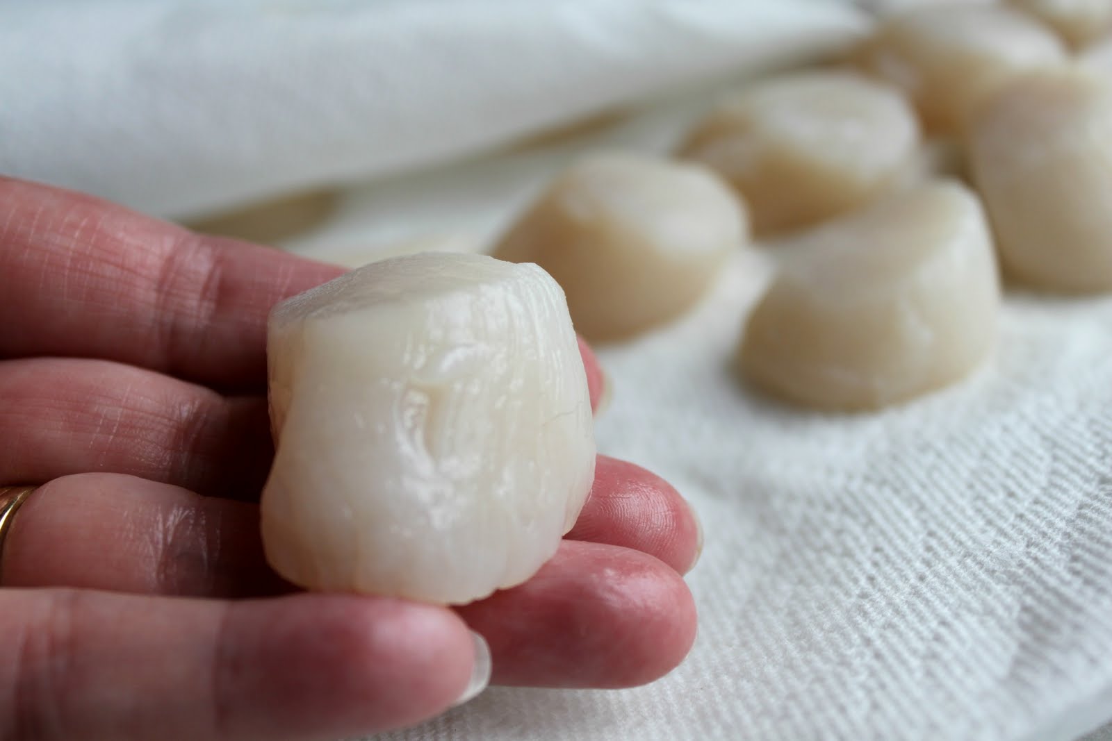 I had frozen the scallops. My “quick thaw” method never involves the microwave. Instead, I rinse them with warm water to separate them, and then soak them. In about 15 minutes, or longer, they are good to go.