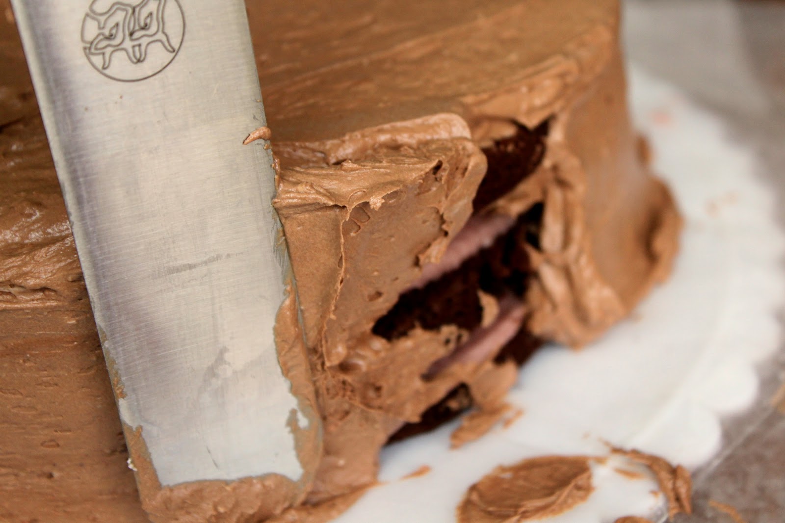 - If the raspberry cream filling has been in the refrigerator, give it a good stir to soften it up a bit. (If it's too stiff, leave it covered at room temperature until spreadable.) Spread the raspberry cream over one of the cake layers. Place the other layer on top of the filling. Frost the rest of the cake (top and sides) with the chocolate buttercream.