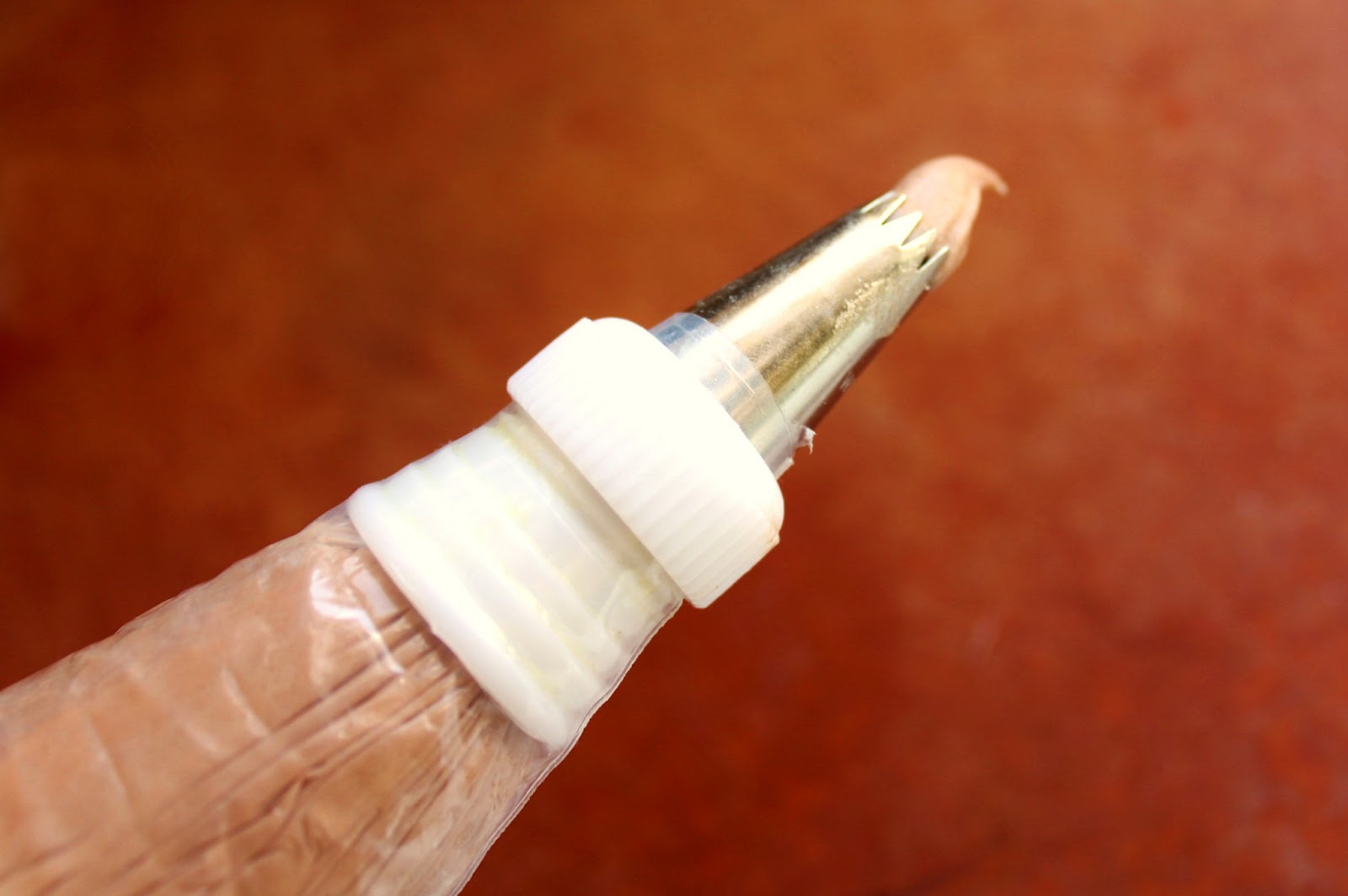 If you think that you’re clumsy with piping bags, I can assure you that they are very easy to work with. I have re-usable piping bags, but I want to show you a very easy piping bag trick. For that I’ll need to use a clear bag. FOR THE RECORD: I’m still awkward and clumsy at using the folded parchment paper trick. So, you need a piping bag and coupler (inexpensive tools, that I buy at a Michael’s Craft Store. Cut the tip off so that the coupler can fit just to the edge, then place the piping tip inside the bag.. Attach the “ring” on the outside and you’re ready for frosting. The most common way to fill the piping bag is to fold it into a cuff, place it into a glass and fill it. Ah! Try this– place a cup or two of frosting onto plastic wrap.