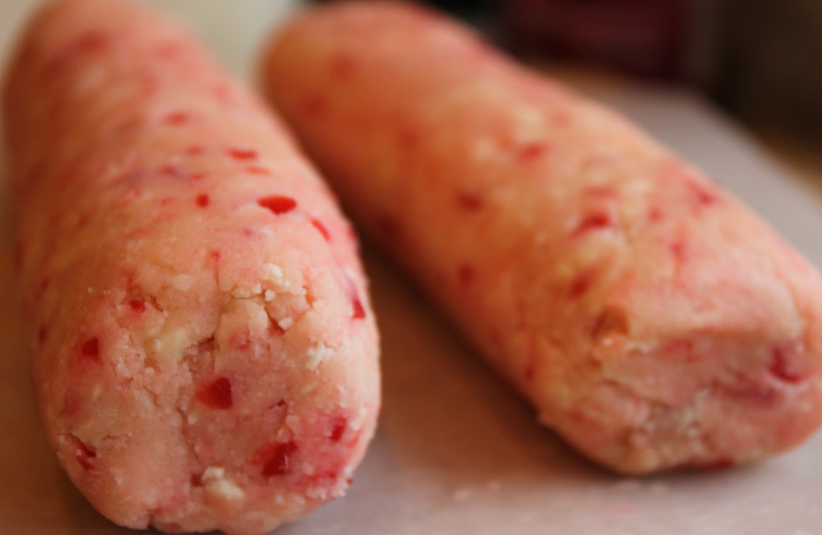 I love shortbread, anything that has almond flavor and maraschino cherries. So, when I found this recipe I knew I had to try it. I know… I’ve heard the “red dye scare” about maraschino cherries, but I don’t care! I doubt I eat these often enough to risk the “danger”! These bright red cherries bring back childhood memories of Shirley Temples “mocktails”. My son loves them, too. So, when I tasted the dough to this recipe, I knew I had a winner.