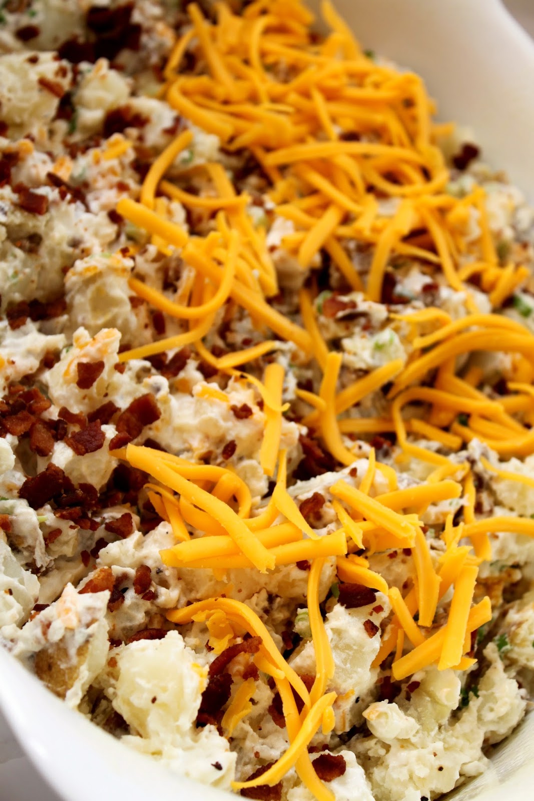 - Whisk the sour cream and mayonnaise in a bowl, then add to the cut-up potatoes. Be sure to reserve some of the cheese, and 1/4 cup of the green onion and about 1/2 cup of the bacon. Add the remaining ingredients and gently fold to combine.