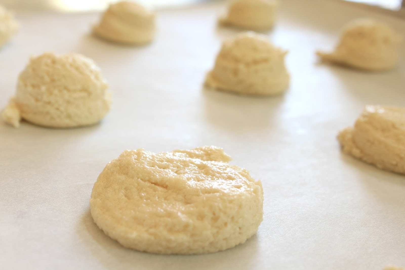 - I like to use a 2-inch cookie scoop to measure 12 cookies per sheet, spaced about 2″ apart. With the flat of your palm (I lightly moistened my hands with water so the dough doesn’t stick), gently press the cookie down just enough to flatten it out to be even.