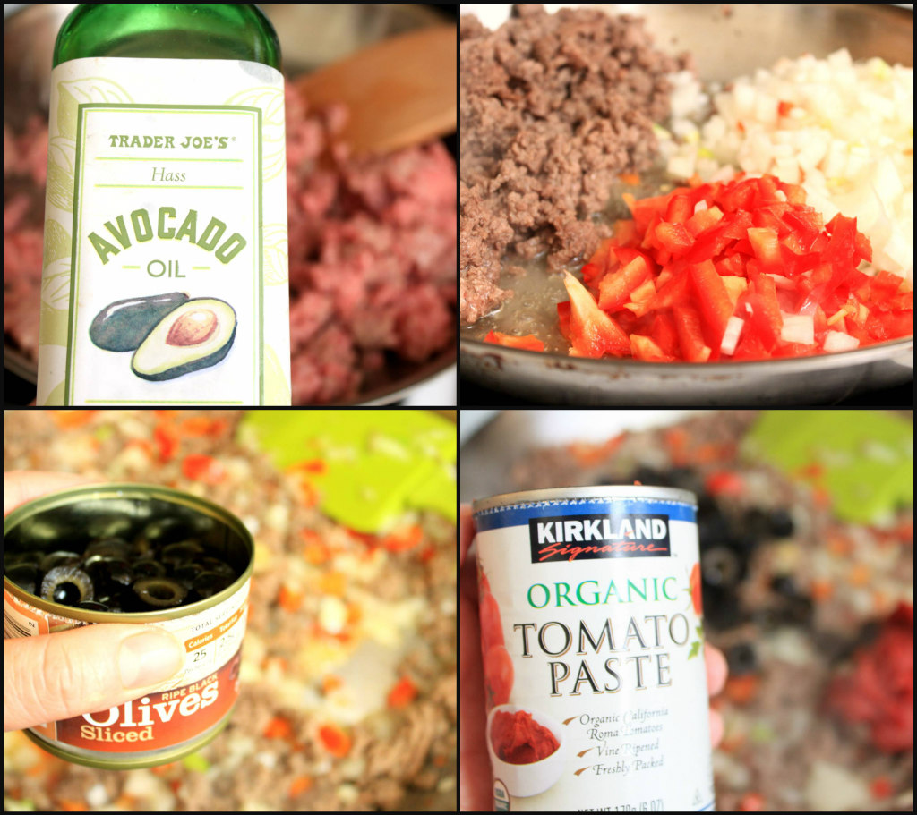 I discovered Avocado Oil at Trader Joe’s and like using it in lieu of olive oil, because it has a higher smoke point. If you ever spot it, buy some! It’s great. Once I browned the ground beef, I added a chopped onion and red bell pepper.