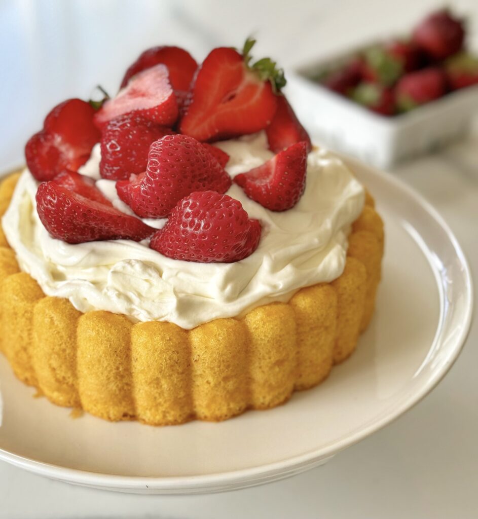 A Charlotte Cake is typically a circular mold lined with ladyfingers or sponge cake. Nordicware makes a Charlotte Pan that “mimics” the ladyfingers, creating an center indentation that can be filled with custard or whipped cream. This recipe makes a tender chiffon cake. To showcase our locally grown seasonal strawberries, I’ve filled the cake with fresh whipped cream. This is a showstopper dessert!