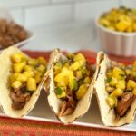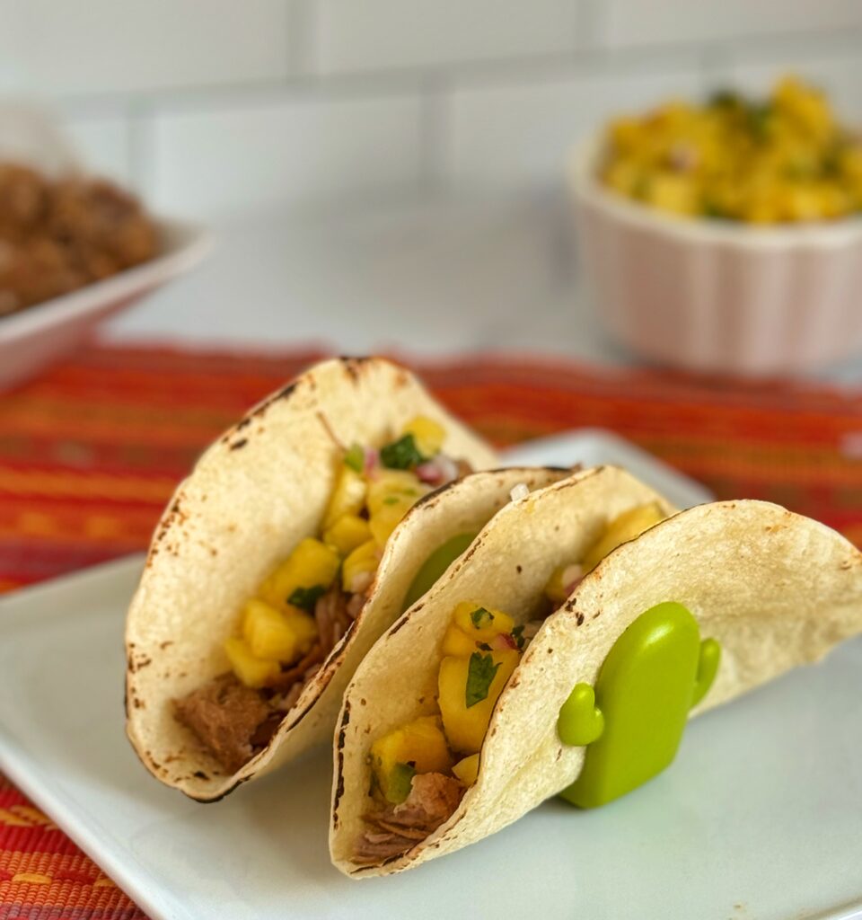 TASTING NOTES: When I made this recipe, I completely forgot to add the pineapple rinds on top of the pork in the pressure cooker. D’oh! I didn’t realize that until I began editing the photos. The next time I make this, I’ll remember that step. The pork was tender and flavorful, just the same. Pineapple salsa is one of my favorites (adding mango is a great addition with pork recipes). Any leftover pork can be used to make burritos as well.