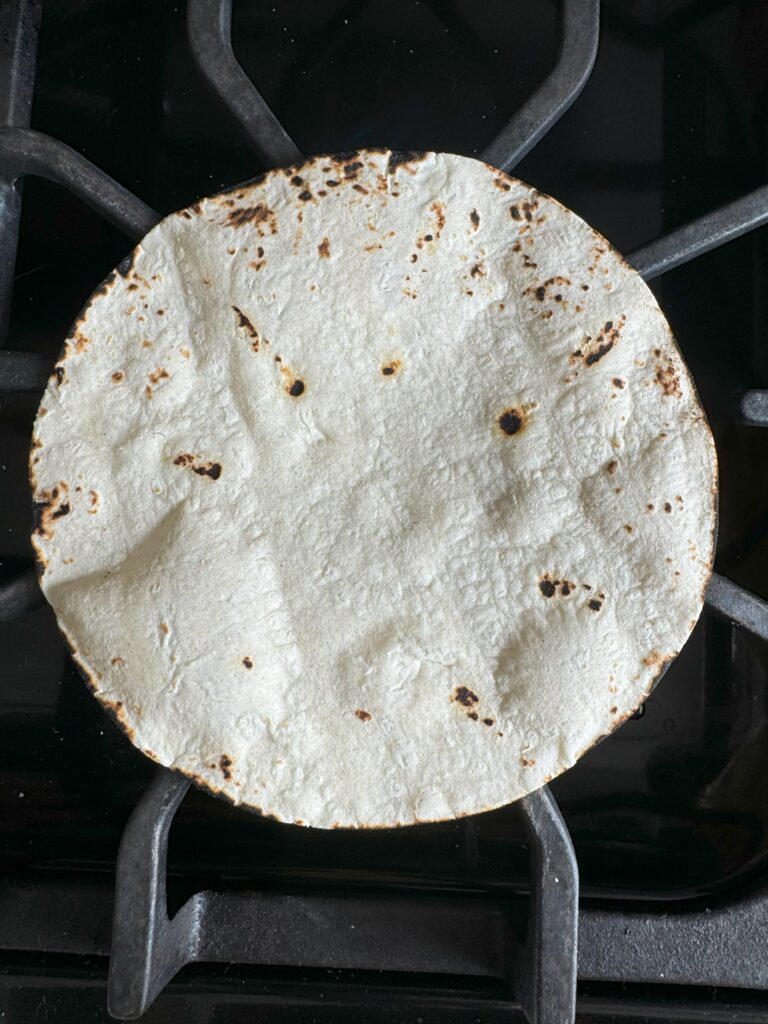 Corn tortillas are ideal, and authentic, for assembling the tacos. I like to heat them up, and give them a bit of char over a gas burner. Otherwise, a cast iron skillet works well.