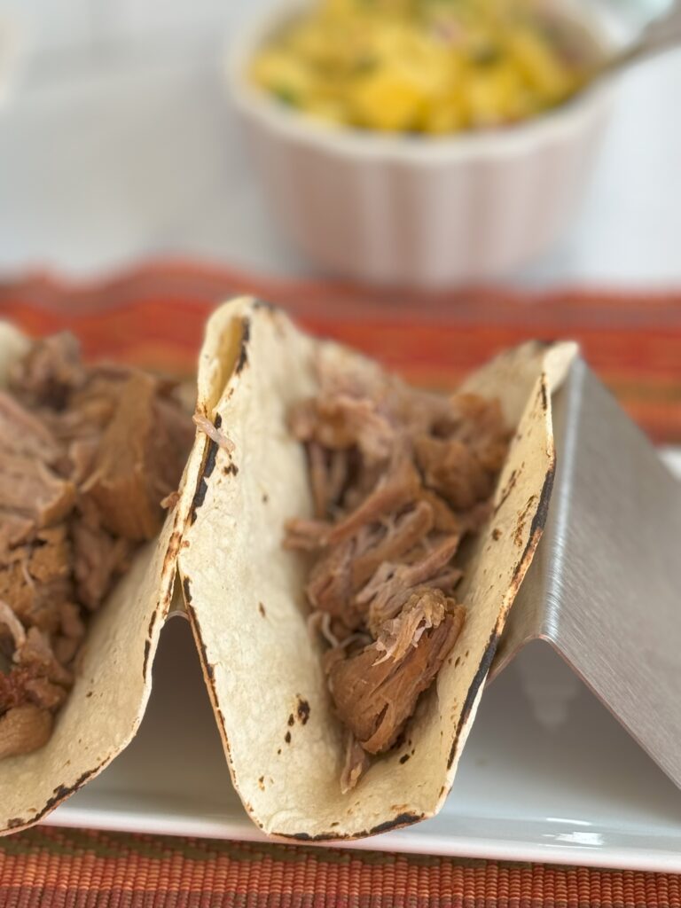 You can fill the tortilla with the plain shredded pork OR in a bowl, toss the shredded pork with a bit of the sauce for a “wetter” texture.