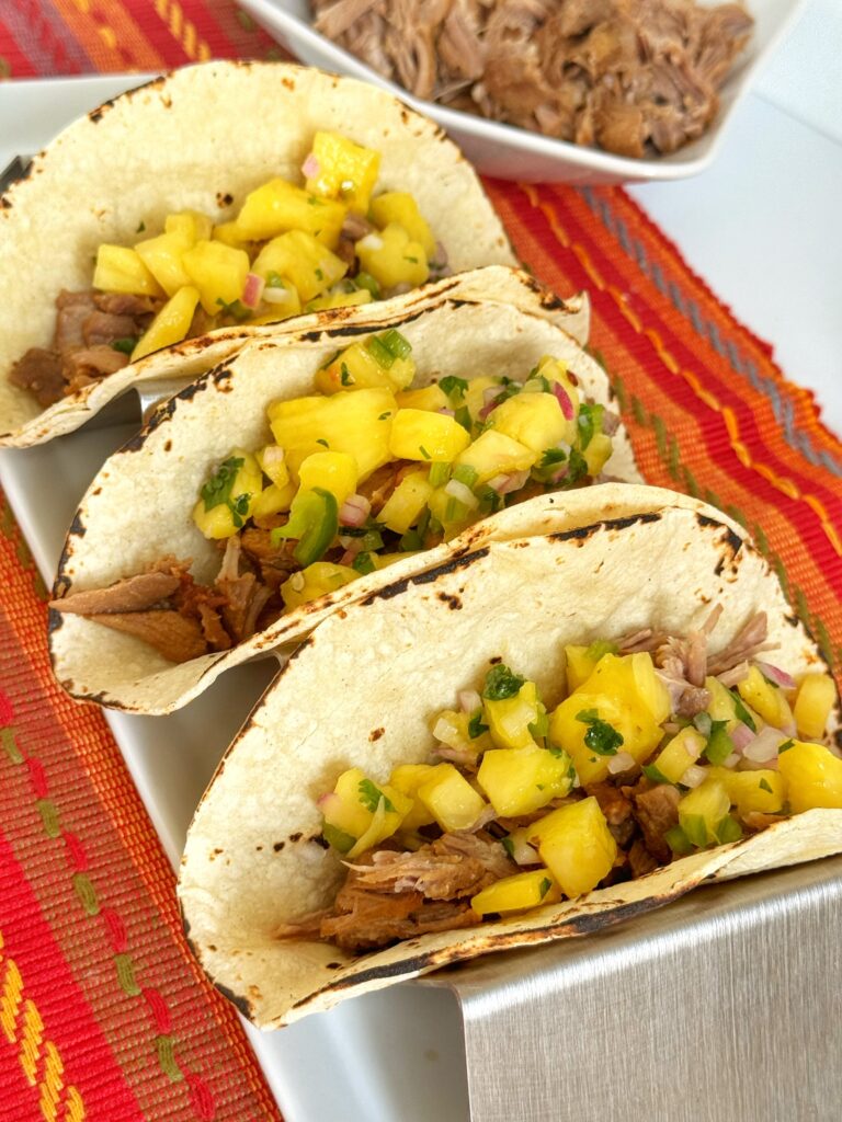 Tacos al pastor are a traditional Mexican dish of marinated pork, traditionally slow-cooked on a vertical spit with pineapple, then sliced thin and served in corn tortillas with toppings like cilantro and onion. This recipe can be made in a slow cooker in 5 hours. I chose to use my pressure cooker to reduce the cooking time to 45 minutes. I also made a fresh pineapple salsa to garnish the charred corn tortillas. Delicioso!