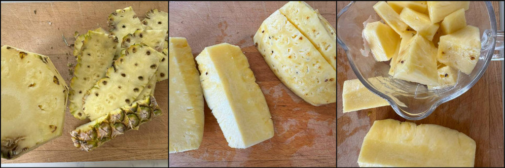 A fresh pineapple is ideal, instead of canned pineapple. Cut off the outside peel. Slice into quarters and remove the hard core. Cut into chunks. If you opt to make the Homemade Pineapple Salsa recipe (super easy), set aside about 2 cups of pineapple.
