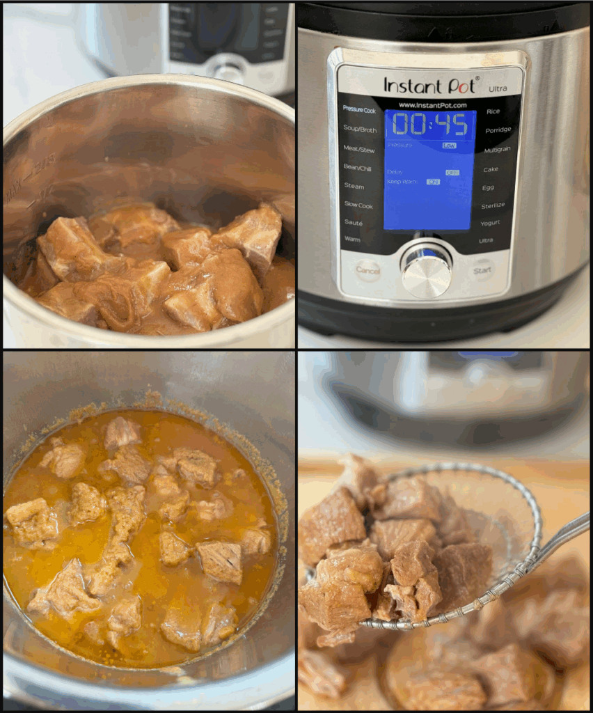 - Lock the lid on and set for 45 minutes. Once the pressure cooker beeps, do a quick pressure release. Carefully remove the lid and using a slotted spoon, remove to a cutting board.